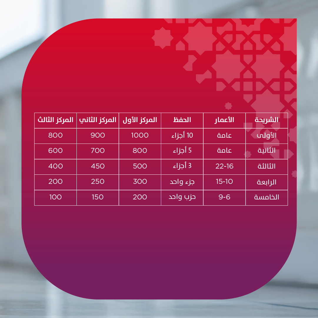 - تُنظَّم المسابقة وفق نظام الشرائح العمرية، على أن تنقسم كل شريحة إلى قسمين منفصلين (ذكور – إناث)